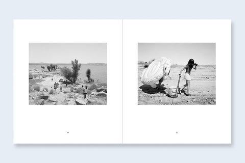 “From 2021 to 2023, I photographed around two reservoirs in the Central Valley of California experiencing a twenty-three year megadrought. The Reservoir weaves together images of the drying lakes and people seeking a leisurely day at the beach. They bring their dogs, babies and baby carriages, inner tubes, kayaks, rafts, umbrellas, coolers, and tents. As the summer progresses and the waterline recedes, families walk over a mile to reach the beach. At times, the sky is colored with smoke from nearby forest fires. The photographs in The Reservoir are part of an ongoing exploration in my work of how droughts, climate change, and ever-present anxiety collectively maps onto life in the American West.” — Mimi Plumb